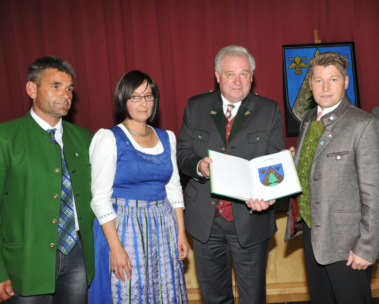 „In blauen Schild eine silberne, mit grüner Tanne auf grünem Berg belegte Spitze, oben beseitet von je einer goldenen heraldischen Lilie mit Staubgefäßen“, lautet die offizielle Beschreibung des Wappens, dessen Führung bereits im Sommer des vergangenen Jahres von der steirischen Landesregierung beschlossen wurde. In seinen Dankesworten betonte Bürgermeister Josef Meier, daß damit ein wichtiger Schritt des Zusammenrückens der sieben Ortsteile gesetzt worden sei: „In eine gemeinsame und verbindende Zukunft“, so der Neumarkter Bürgermeister in Anspielung an die nicht leichten Voraussetzungen vor der Gemeindefusion.